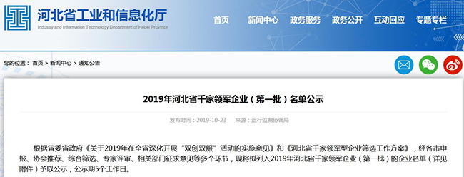 荣耀体育网页版获得河北省第一批千家领军企业称号