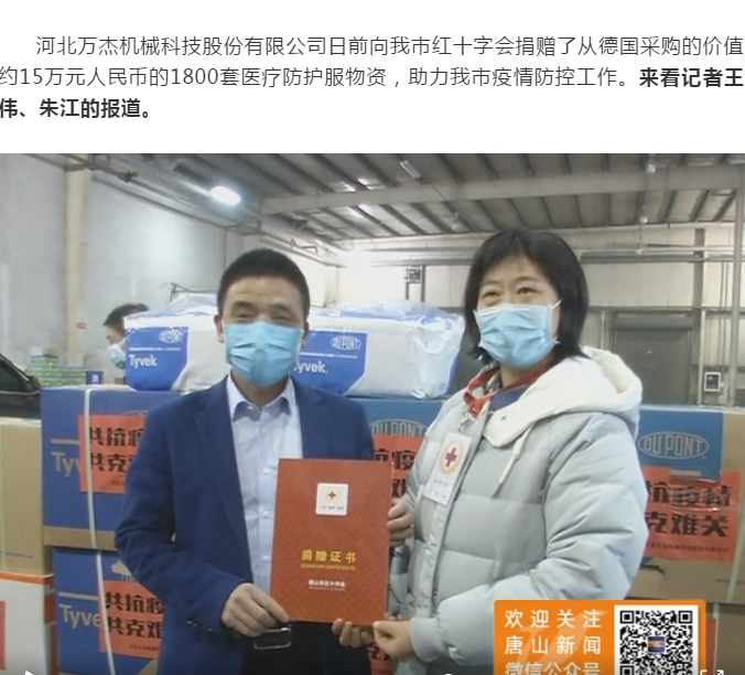 与此同时,万杰科技积极联系市级、县级人民政府准备医疗物资的捐赠事宜,各级政府表示高度重视并为医疗物资的顺利抵达帮助良多。万杰科技在以快速度拿到防疫物资后,捐赠了从德国购入的价值约15万元人民币的1800套医疗防护服给唐山市红十字会,同时还捐赠了约1万个医用口罩以及10箱84消毒液给市县级人民政府的防疫工作。“顾大局,识大体,勇担当”也是万杰科技在未来发展的一个方向,并努力不愧于各级人民政府所评价的爱心科技型企业。