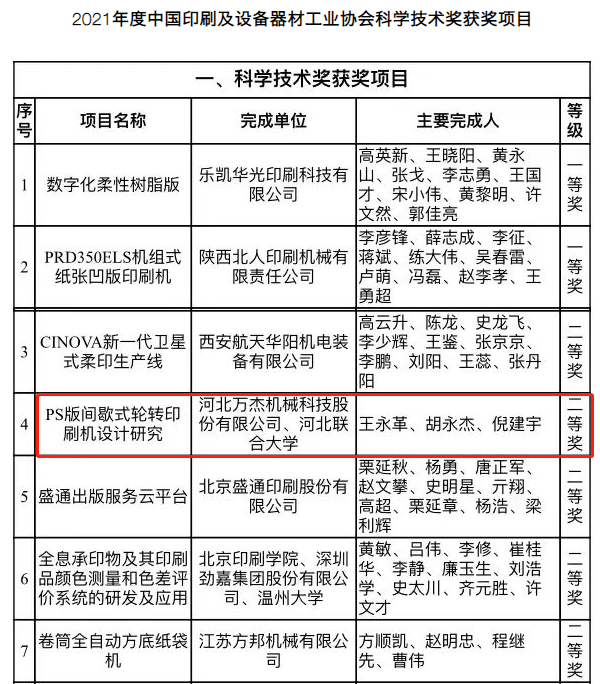 荣耀体育网页版自主研发的ps版间歇轮转印刷机获得中国印刷及设备器材工业协会科学技术二等奖